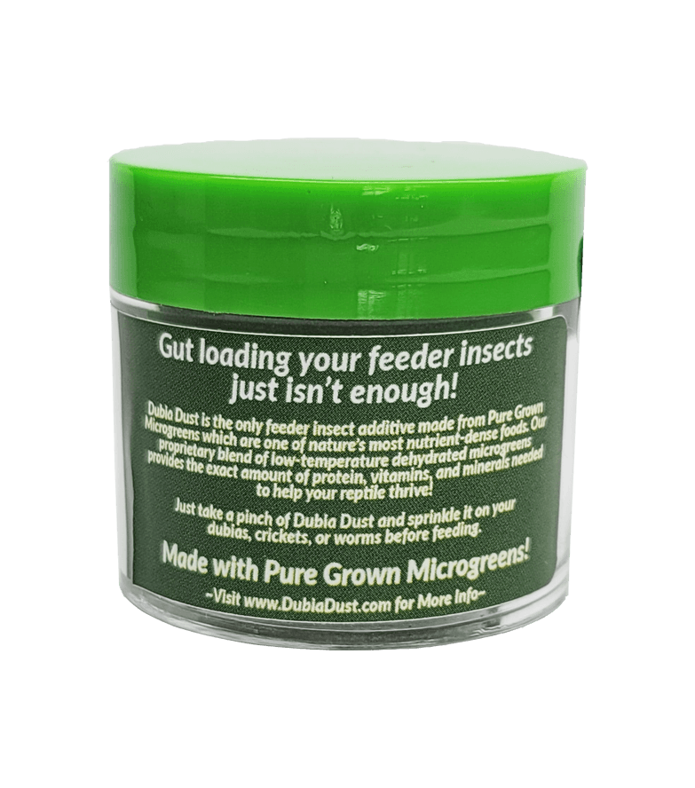 Dubia Dust is the only feeder insect additive made from Pure Grown Microgreens! Microgreens have been clinically proven to be one of nature’s most nutrient-dense foods. Our proprietary blend of low-temperature dehydrated vegetables provides the perfect amount of protein, vitamins, and minerals needed to help your reptile thrive. Just take a pinch of Dubia Dust and sprinkle it on your feeder insects to increase their nutritional value. A little goes a long way!